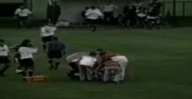 Leia maisAtacante Barbosa ajuda o meia Sandro Ventura no treino físico realizado no gramado do Scarpelli, na década de 90. Barbosa…