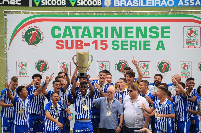 Jogadores do Sub-15 do Avaí erguem a taça de Campeão Catarinense 2019, ao lado do presidente do clube, Francisco Battistotti.…