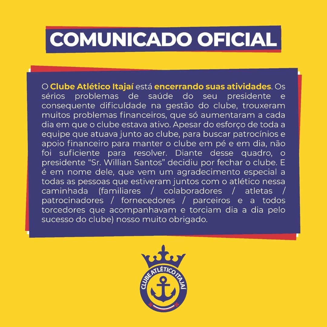 O Clube Atlético Itajaí, fundado em 2016, anunciou nesta segunda-feira (24) o encerramento das suas atividades no futebol profissional.