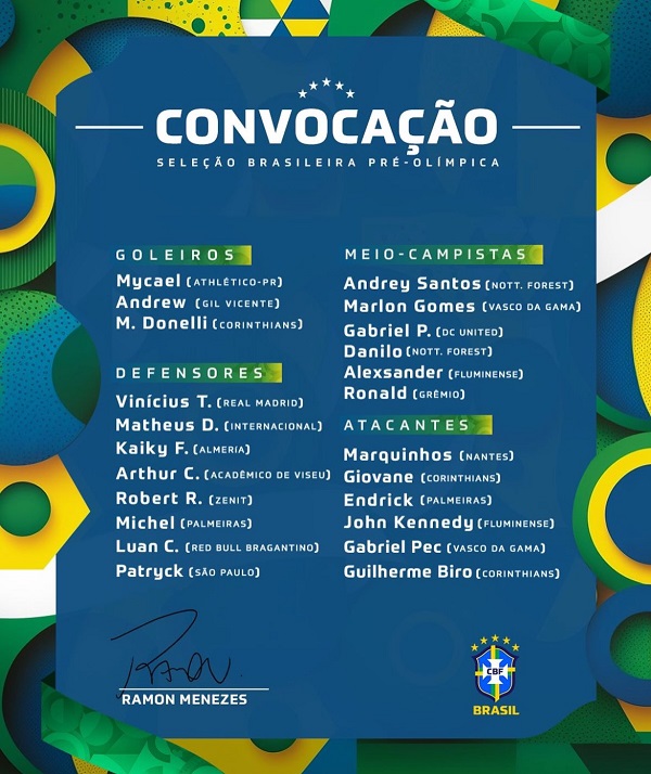 Treinador Ramon Menezes convocou os 23 jogadores para a disputa do Pré-Olímpico na Venezuela, de 20 de janeiro a 11…