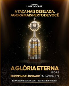 O troféu – símbolo máximo da Glória Eterna – terá uma presença especial na Gloria Eterna Store de sexta-feira, 17, a domingo, 19 de abril, no Shopping Eldorado, em São Paulo. Durante esses dias —das 13h às 21h (sexta-feira, 17, e sábado, 18) e das 14h às 20h l(domingo, 19) — os fãs poderão se aproximar para viver um momento único diante do ícone que