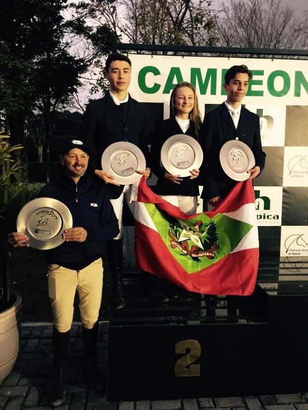 A amazona Gabriele Fontoura Berger (com o cavalo Quite Capitano) e o cavaleiro Marco Antônio Ghizoni (IMNA) da SHC e o cavaleiro Vinicius Ismael Travessini Leme (R2D SL Ilustre), ficaram em segundo lugar por equipe na categoria Pré-Júnior (saltos de 1,30m).
