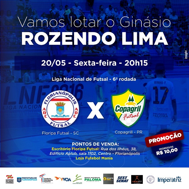Promoção para lotar o Ginásio Rozendo Lima! Os ingressos para o jogo entre Floripa Futsal e Copagril-PR pela sexta rodada da Liga Nacional começam a ser vendidos nesta quarta-feira. O jogo será realizado nesta sexta (20), às 20h15. Confira abaixo o serviço da partida.