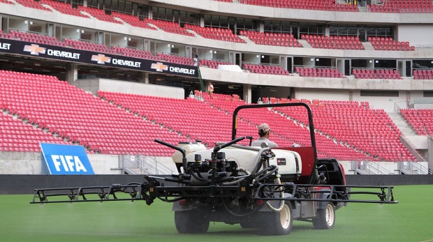O estádio que receberá a Seleção Brasileira está passando pelos últimos ajustes. Dois dias antes de Brasil x Uruguai, o gramado da Arena Pernambuco recebeu um tratamento especial, com aplicação de uma mistura líquida que ajuda a deixar o piso perfeito para a prática do futebol.