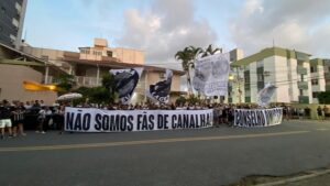 Protesto da torcida do Figueirense, nesta noite de quarta-feira (4), no Scarpelli. O descontentamento é com a diretoria da SF e do Conselho Deliberativo. O Figueirense também está na iminência de disputar a Série B de SC em 2027.