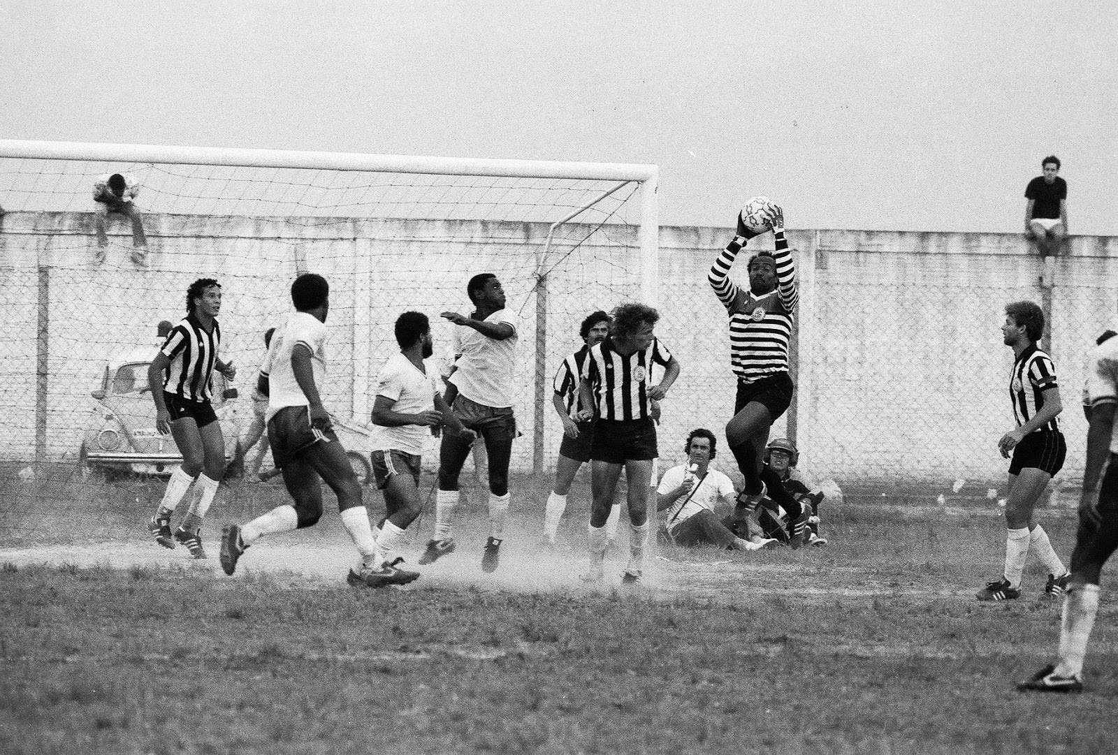 Jogo entre Laguna e Figueirense pela 2ª divisão do futebol catarinense, em 1987. O goleiro com o uniforme zebrado é o Peçanha. O lateral Rocha (de bigode) está rente a trave e quase na risca do gol o zagueiro Agnaldo (Liz). Tem a turma em cima do muro (lá atrás) e os dois repórteres atrás do gol. O de camisa branca é o Márcio Cardozo, de Criciúma, e o de boné e agasalho sou eu mesmo, pela RCE.