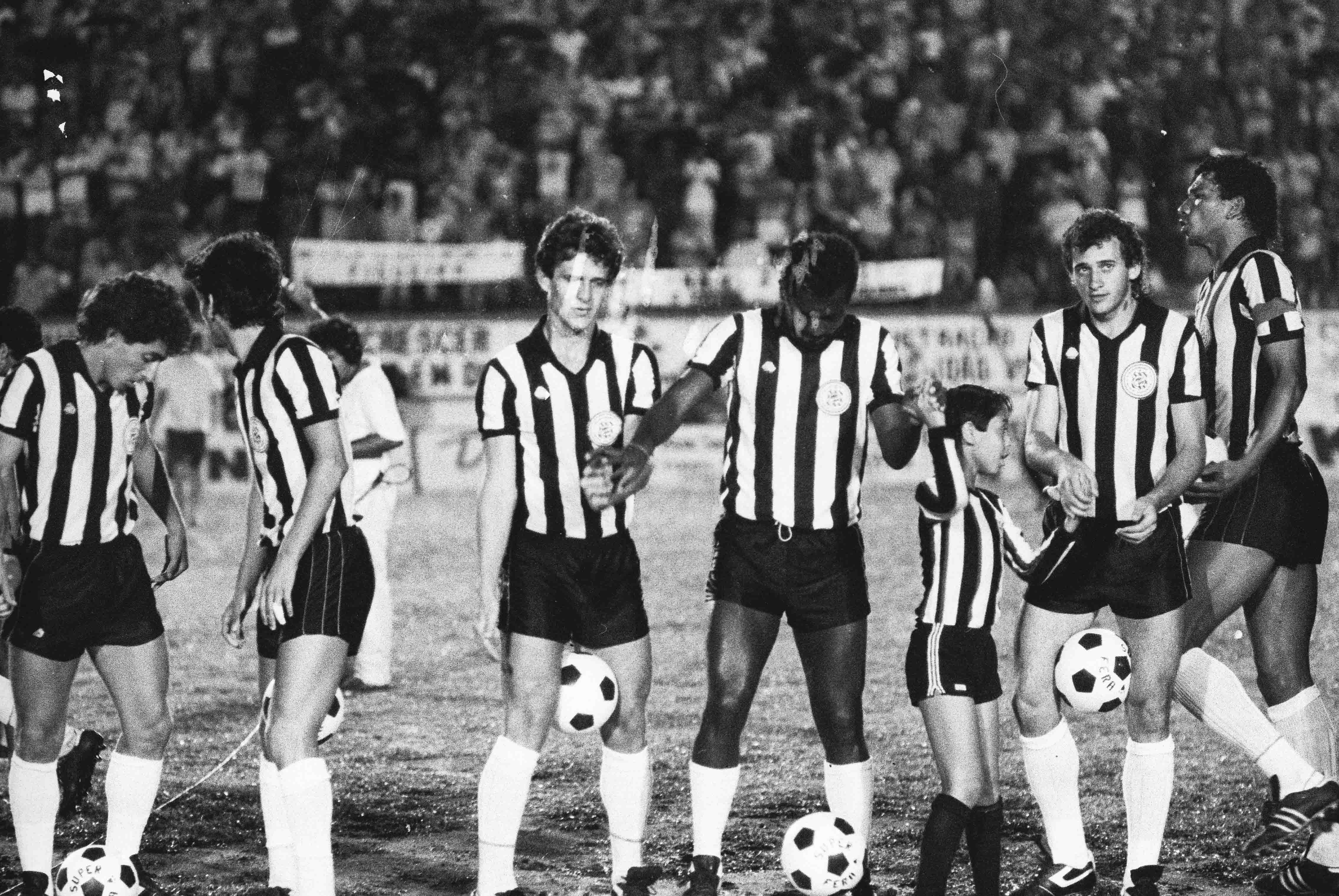 Figueirense em campo e saudando a torcida no Scarpelli, em jogo noturno, na década de 90. Os dois da direita: Ídolo Albeneir e o volante Alaércio, ex-Grêmio e Fluminense. Os dois da esquerda da foto: Amarildo, ponta-direita, que fez o primeiro gol do Avaí na Ressacada, 15/nov/1983,e anos depois se transferiu para o maior rival, e Sérgio Gil, da Família Gil, dos fantásticos Almir e Tonho Gil, que faleceu em acidente automobilístico. Foto: Arquivo Pessoal/Polidoro Júnior.