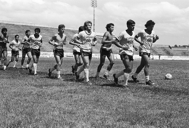 O zagueiro Meira e o ponta Abel puxam a fila no treinamento físico, sendo que também reconheço Agnaldo, Daniel Frasson, Washington e Carlos Alberto Batata.
